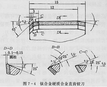 鈦合金鉸刀的幾何參數(shù)一般選用前角γ0=0°~5°,硬質(zhì)合金鉸刀取小值;后角α0=10°~15°;切削錐角κr=15°~30°。階梯鉸刀的第二錐角為15°,刃傾角λs=-15°。為了加大鈦合金鉸刀的容屑空間,齒數(shù)應(yīng)少于標準鉸刀,齒槽角δ=85°~90°。各種鈦合金鉸刀參數(shù)見圖7-3、圖7-4和圖7-5。