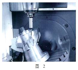 應用三軸加工中心加工一個模具的側(cè)壁時,側(cè)壁的深度就決定了選用刀具的長度,刀具長度必須大于側(cè)壁的深度,刀具長度增加,就會降低刀具的強度,如果刀具長度超過3倍徑就會出現(xiàn)讓刀現(xiàn)象,很難保證工件質(zhì)量(見圖3)。利用五軸加工中心加工工件側(cè)壁,可以擺動工件或主軸使刀具與工件側(cè)壁垂直,然后選用平面銑刀銑側(cè)壁,能很好地保證工件質(zhì)量又能延長刀具壽命(見圖4)。