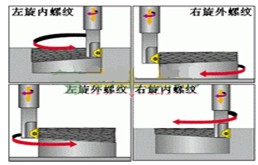 螺紋銑刀使用靈活,可以適用多種工況。例如:可以用同一把螺紋銑刀加工左旋螺紋,也可以加工右旋螺紋;既可以加工外螺紋,也可以加工內(nèi)螺紋。所有這一切只需要調(diào)整一下插補程序而已(見圖3)。