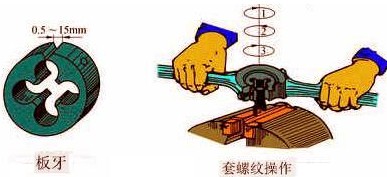 4、板牙開始套螺紋時,要檢查校正,務使板牙與圓桿垂直,然后適當加壓力按順時針方向扳動板牙架,當切入1~2牙后就可不加壓力旋轉。同攻螺紋一樣要經常反轉,使切屑斷碎及時排屑。如上圖套螺紋操作所示。