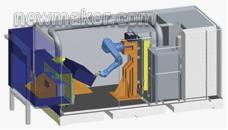 Jenoptik公司更進(jìn)一步,將機(jī)械手、激光器和冷卻裝置集成在一個(gè)平臺(tái)上,實(shí)現(xiàn)緊湊的加工單元,從而滿足工業(yè)實(shí)踐中的要求。圖3顯示的解決方案中,工件的上載和移動(dòng)都通過(guò)旋轉(zhuǎn)臺(tái)完成,激光系統(tǒng)、過(guò)濾裝置等等都位于加工單元的后端。該加工單元本身作為一個(gè)獨(dú)立單位能很容易被移動(dòng),而無(wú)需太多的預(yù)先調(diào)節(jié)。它加工的典型零件尺寸最大為1400mm×700mm×500mm,其整體尺寸分別約為5.20m×2.20m×2.30m (最大功率 600W型號(hào))和5.90m×2.20m×2.30m(功率大于600W型號(hào))。