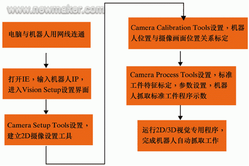 FANUC iR Vision 2DV視覺系統(tǒng)的原理是,選一個待加工工件作為初始工件,通過2DV視覺軟件對該工件在攝像頭中的畫面點位與機(jī)器人示教點位的關(guān)系進(jìn)行標(biāo)定,同時完成初始工件的特征標(biāo)定。示教完成的抓取程序為初始工件初始位置的抓取位置,此時工件抓取偏差值為零。當(dāng)工件平移或者旋轉(zhuǎn)後,位置與初始工件的位置發(fā)生變化。通過2DV軟件,機(jī)器人能夠計算出位置變化量X、Y、R。機(jī)器人把該偏差值存入位置寄存器[PR]中。此時機(jī)器人可以通過把偏差值[PR]補(bǔ)償?shù)匠跏甲ト∥恢脕韺崿F(xiàn)工件的抓取。2DV視覺系統(tǒng)操作流程如圖3。